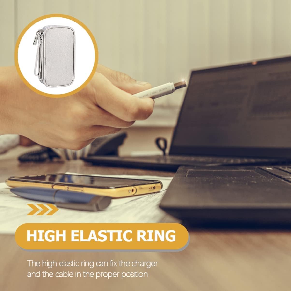 – L’anello elastico alto può fissare il caricabatterie e il cavo nella posizione corretta nella borsa per prodotti elettronici.