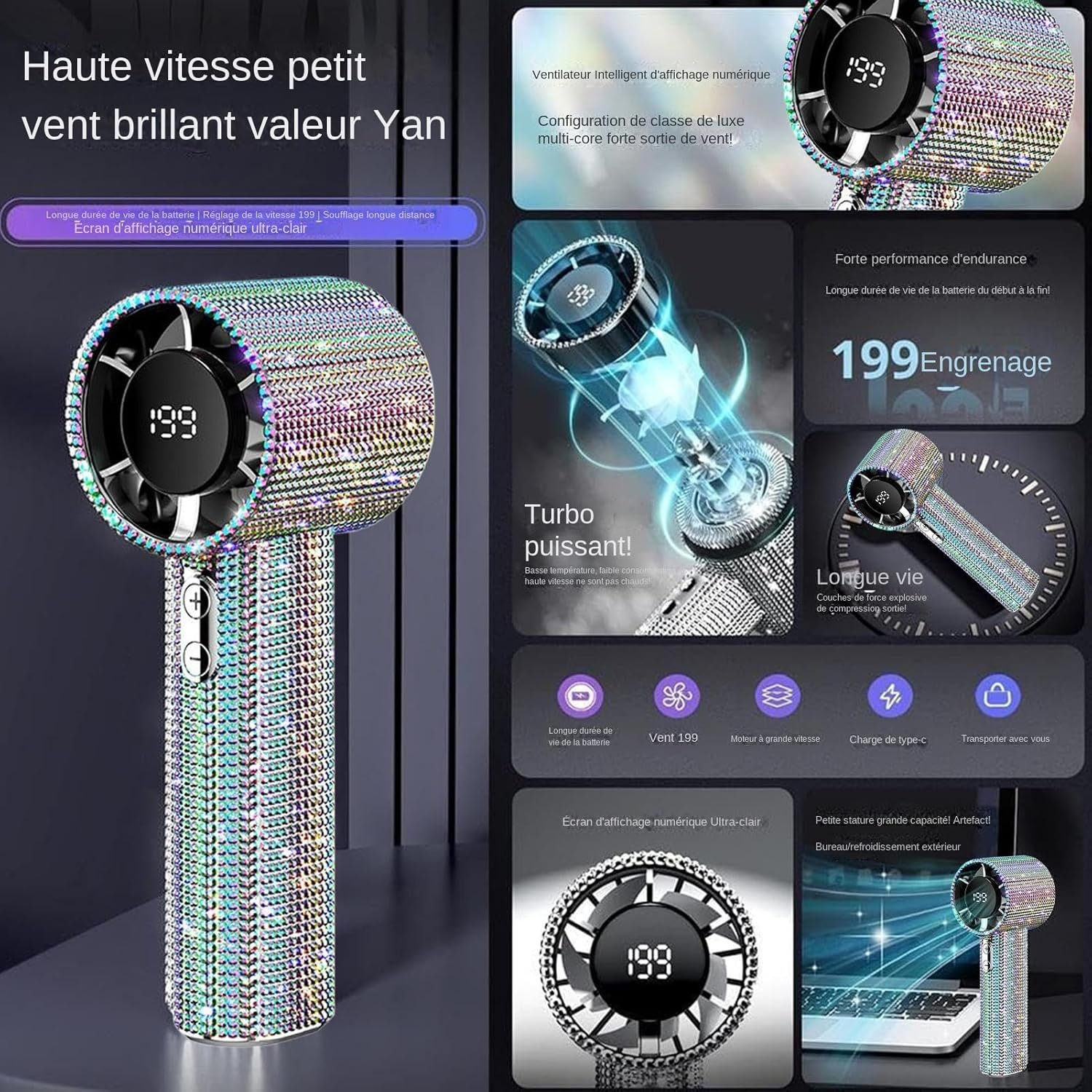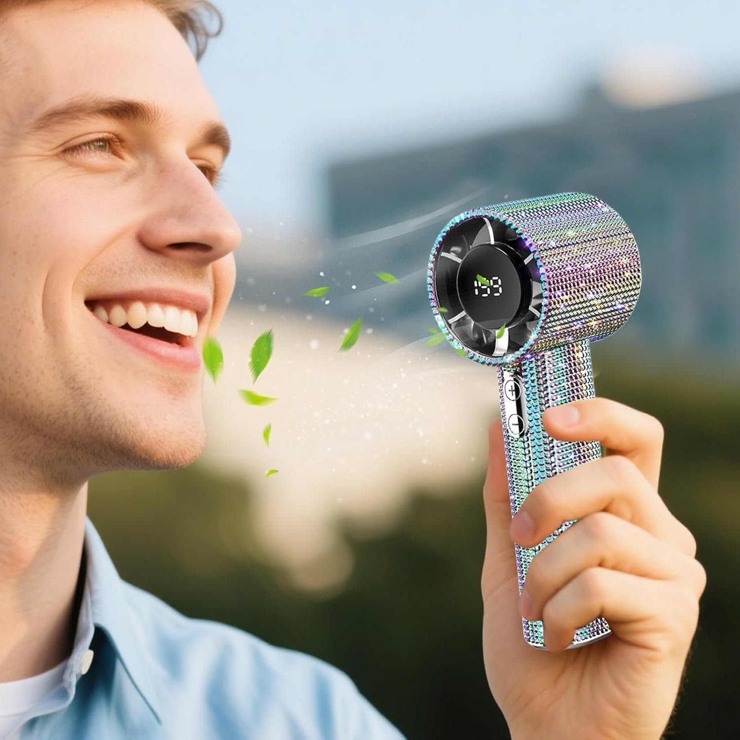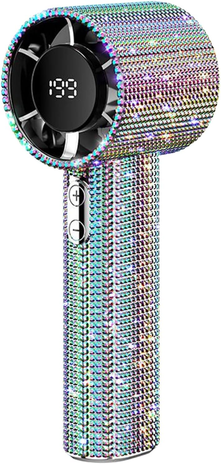 Accessorio portatile: design ergonomico con effetti luminosi fluidi e cristalli scintillanti. Offre una comoda freschezza mentre funge da accessorio alla moda moderno per tutte le tue uscite.